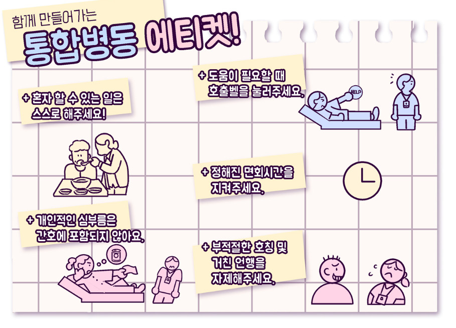 하지만, 개인적인 심부름은 간호에 포함되지 않으며 다른 우선순위 환자가 있는데도 본인을 먼저 해달라고 요구하면 곤란합니다. 또한 환자마다 상황이 다른 데도, 혼자 할 수 있는 일을  다른 환자와 무조건 같은 수준의 서비스로 해달라고 하는 것도 하지 말아야 합니다.