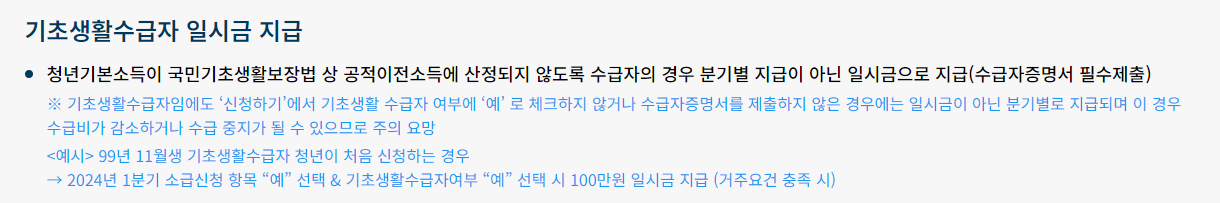 - (기초생활수급자) 수급자인 경우 분기별 지급이 아닌 일시금으로 지급됩니다.