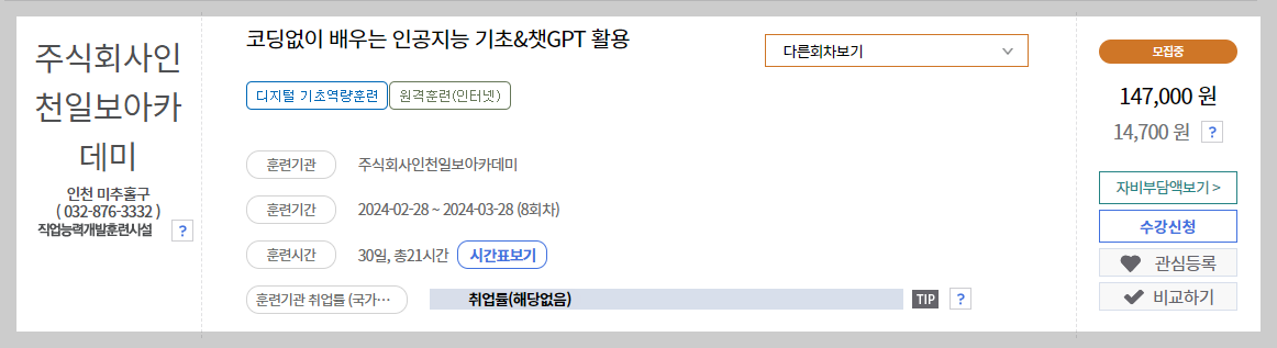 원래 147,000원인 ' 코딩 없이 배우는 인공지능 기초& 챗GPT 활용 강좌'가 자부담액 14,700원으로 수강가능합니다.