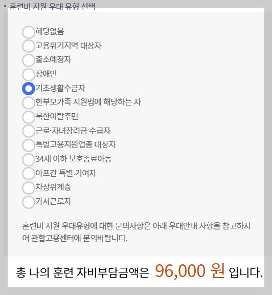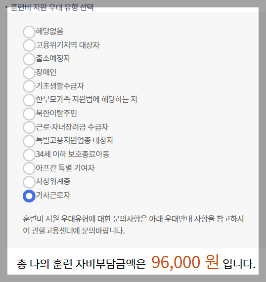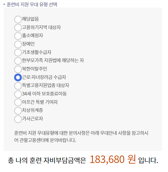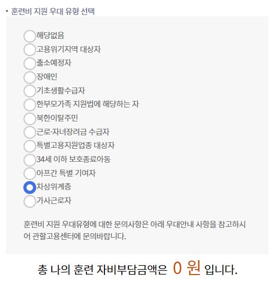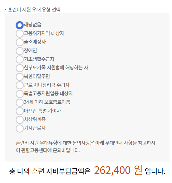 훈련비 지원우대 유형에서 해당사항이 없으면 자부담이 26만 원대이지만, 만약 근로자녀장려금 수급자라면 18만 원대이고 차상위계층, 기초생활수급자, 장애인, 고용위기지역대상자 등이라면 자부담 금액이 0원입니다.