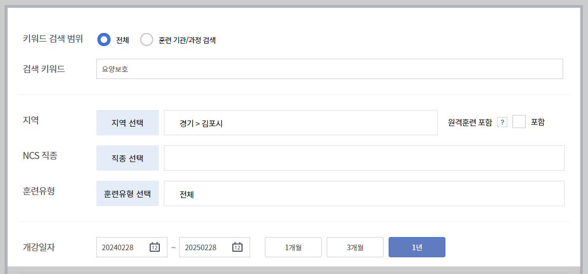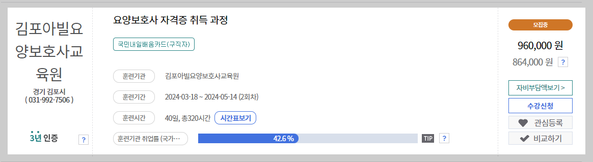요양보호사 과정을 내일배움카드로 배울 수 있나 확인했습니다.