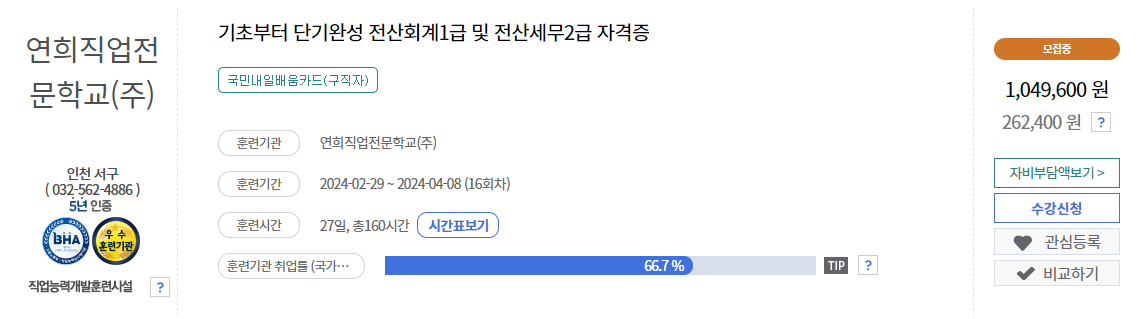 원래 교육과정의 금액은 105만 원 정도인데 자부담 비는 26만 원대입니다.