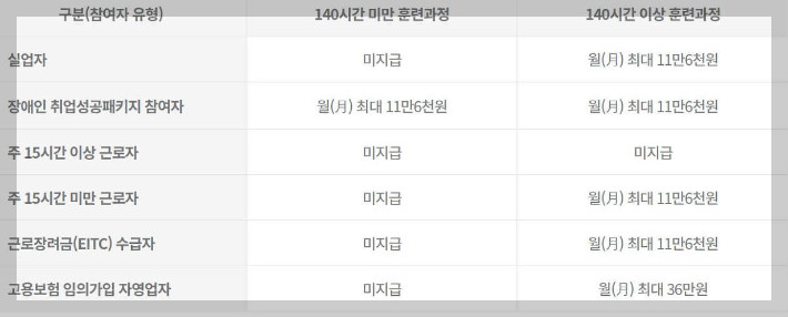 일자리를 구하고 있는 취준생이나 다른 분야로 이직을 희망하는 사람, 업무 역량을 향상하고자 하는 회사원, 은퇴 후 새로운 직업을 찾고자 하는 은퇴자 등 직업 역량 개발에 필요한 훈련을 하는데 큰 도움이 되는 제도입니다.