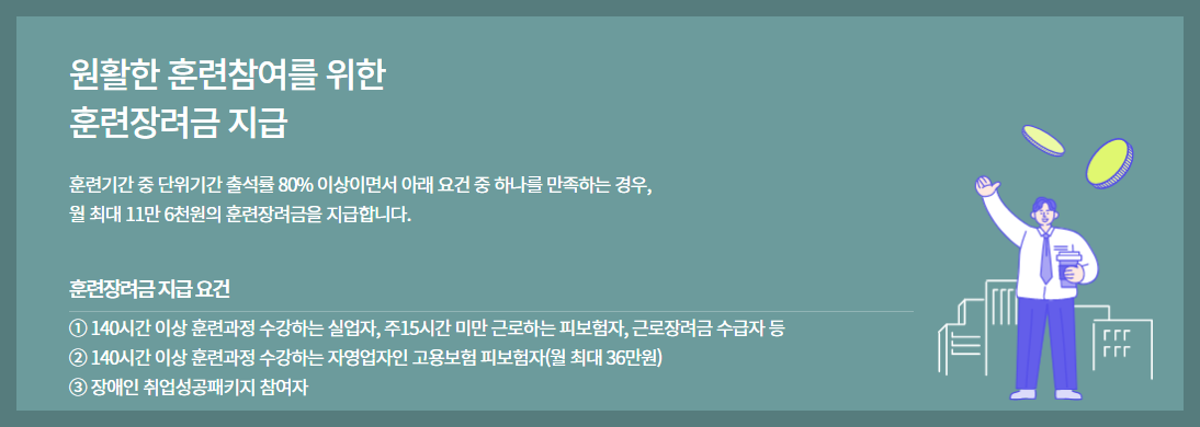 훈련기간 중위 출석률이 80% 이상이면서 요건을 충족하는 경우 근로자의 경우, 최대 월 11만 6천 원의 훈련장려금 지급도 합니다.