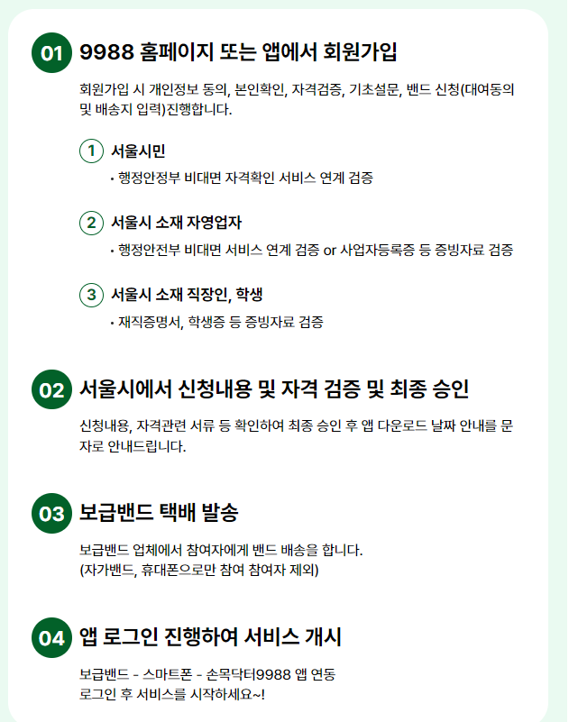 019988 홈페이지 또는 앱에서 회원가입회원가입 시 개인정보 동의, 본인확인, 자격검증, 기초설문, 밴드 신청(대여동의 및 배송지 입력)진행합니다.서울시민 행정안정부 비대면 자격확인 서비스