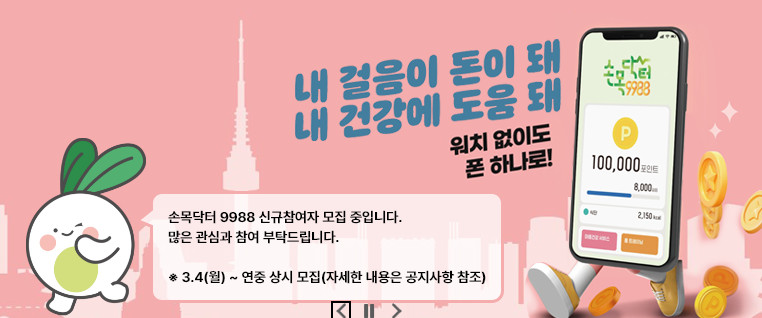 손목닥터9988로 쌓을 수 있는 최대 포인트는 신규참여자 10만, 연속참여자 7만입니다.