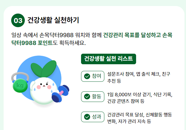 그 후에는 앱 출석체크, 1일 8 천보(70세 5 천보) 이상 걷기, 식단 기록 등 건강생활 실천을 하며 포인트를 쌓습니다.