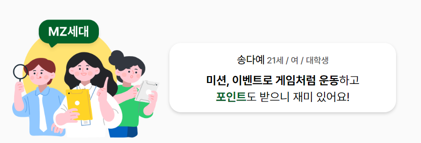 젊은 MZ세대들에게는 걷기 챌린지나 리워드 적립, 홈트레이닝 체형교정 운동 등 흥미롭게 운동을 하도록 유도하고 포인트를 제공하여 실행률을 높입니다.