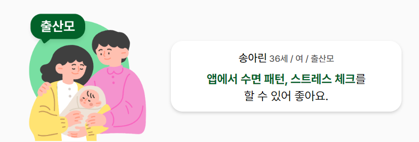 출산모들은 앱에서 수면 패턴 분석, 스트레스 지수 확인, 호흡명상 등을 활용할 수 있습니다.