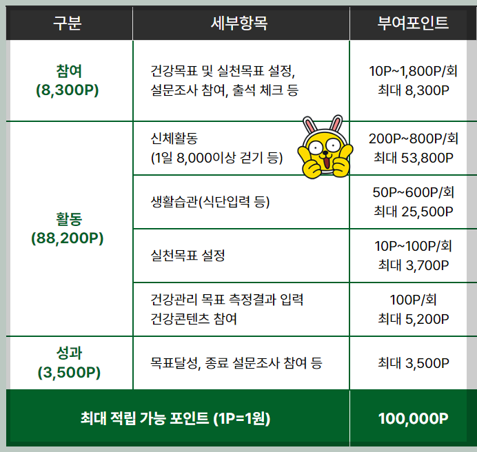 하루에 8 천보 이상 걷기(70세 이상은 5 천보), 건강목표 및 실천목표 설정, 식단 입력하기 등을 실천하면 사업 기간 중에 최대 10만 포인트를 제공합니다.