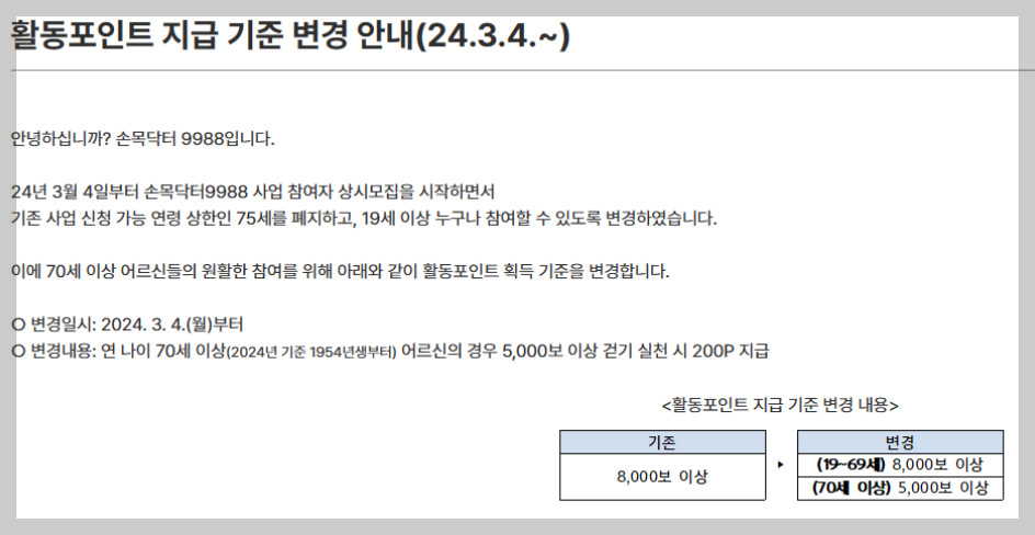 70세 이상 어르신들은 하루 8 천보의 기준을 낮추어 5 천보 이상 걷기 실천을 하면 200P를 지급합니다.