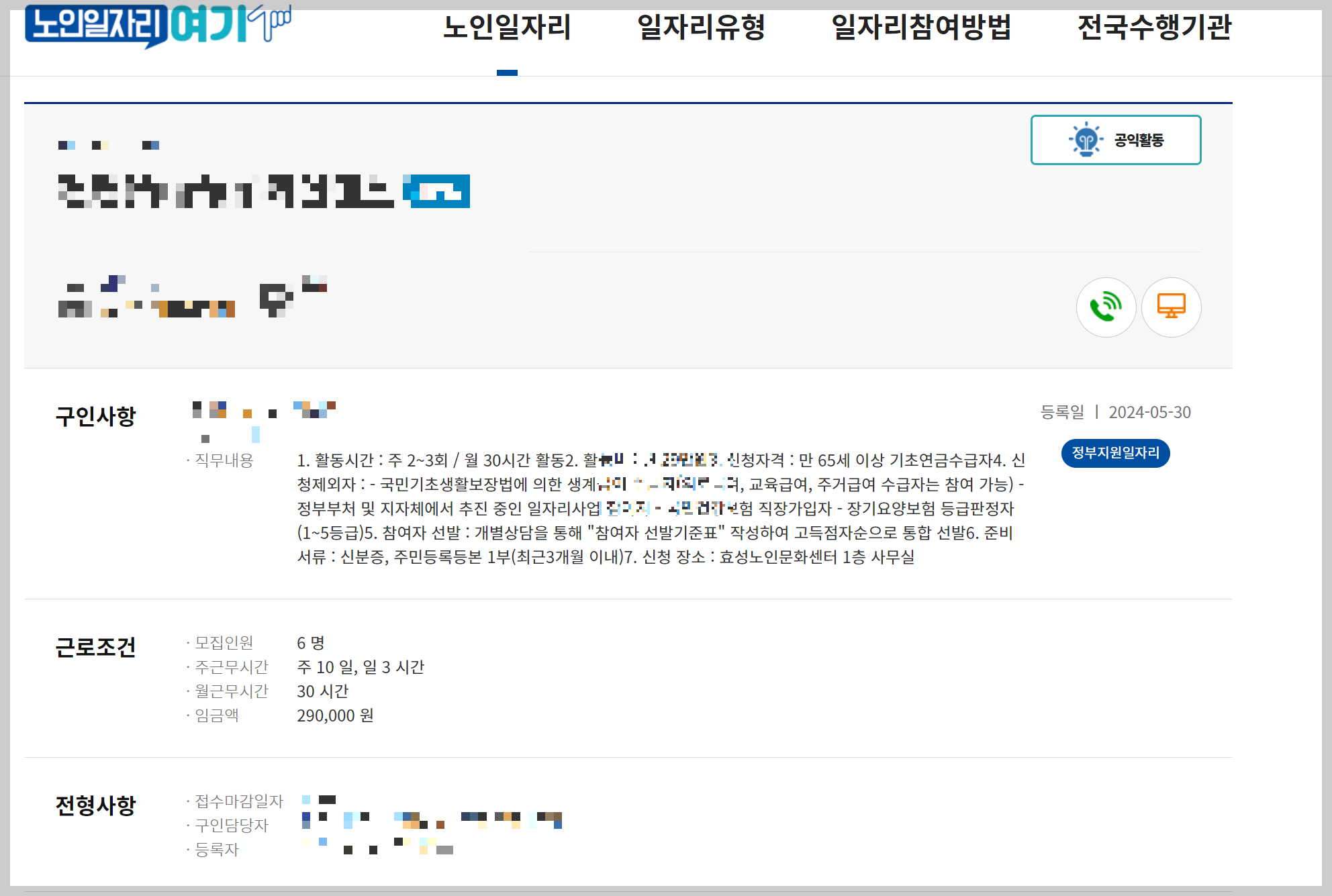 '공익활동'에 해당하는 일자리이며 사업체명, 구인사항, 근로조건 등과 접수 연락처를 확인할 수 있습니다.