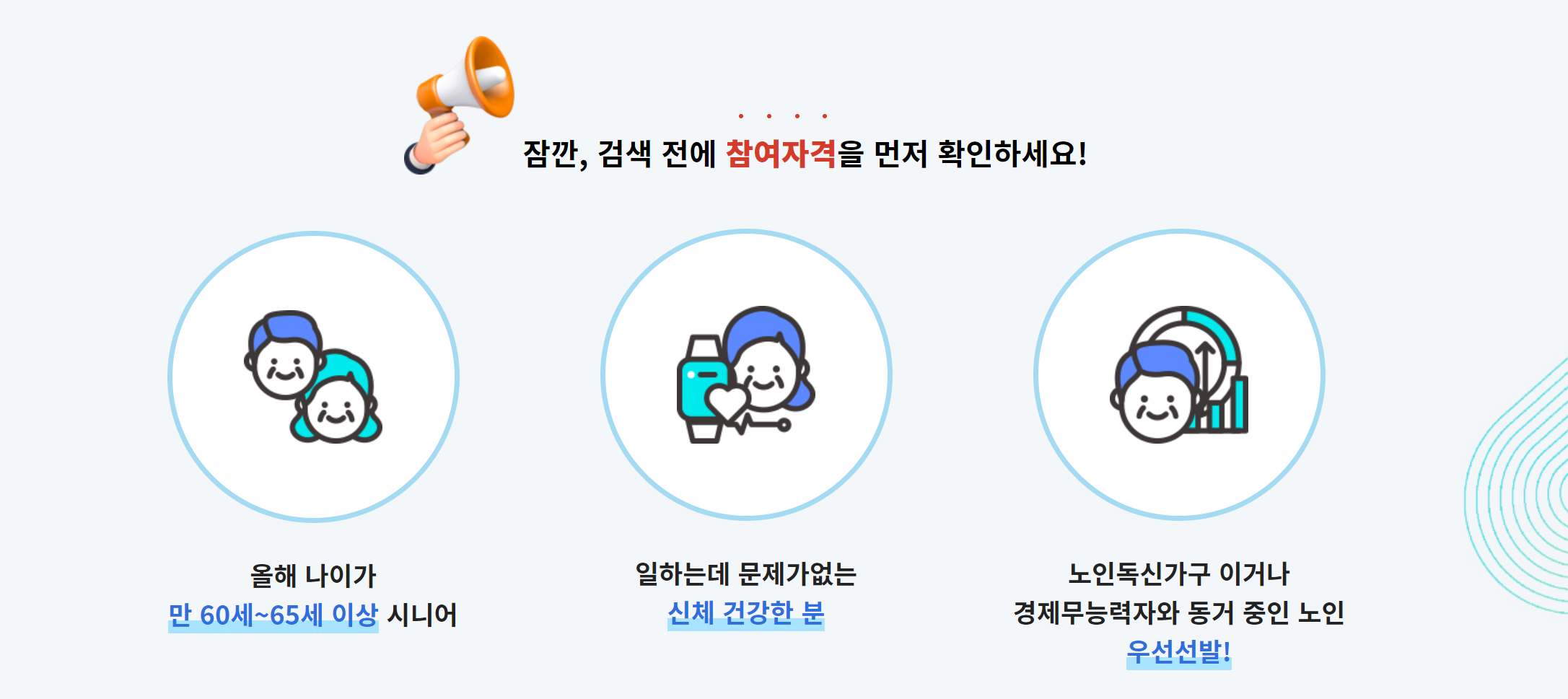 노인일자리 여기에서 노인일자리를 검색하기 전에 참여자격을 확인해 보시기 바랍니다.