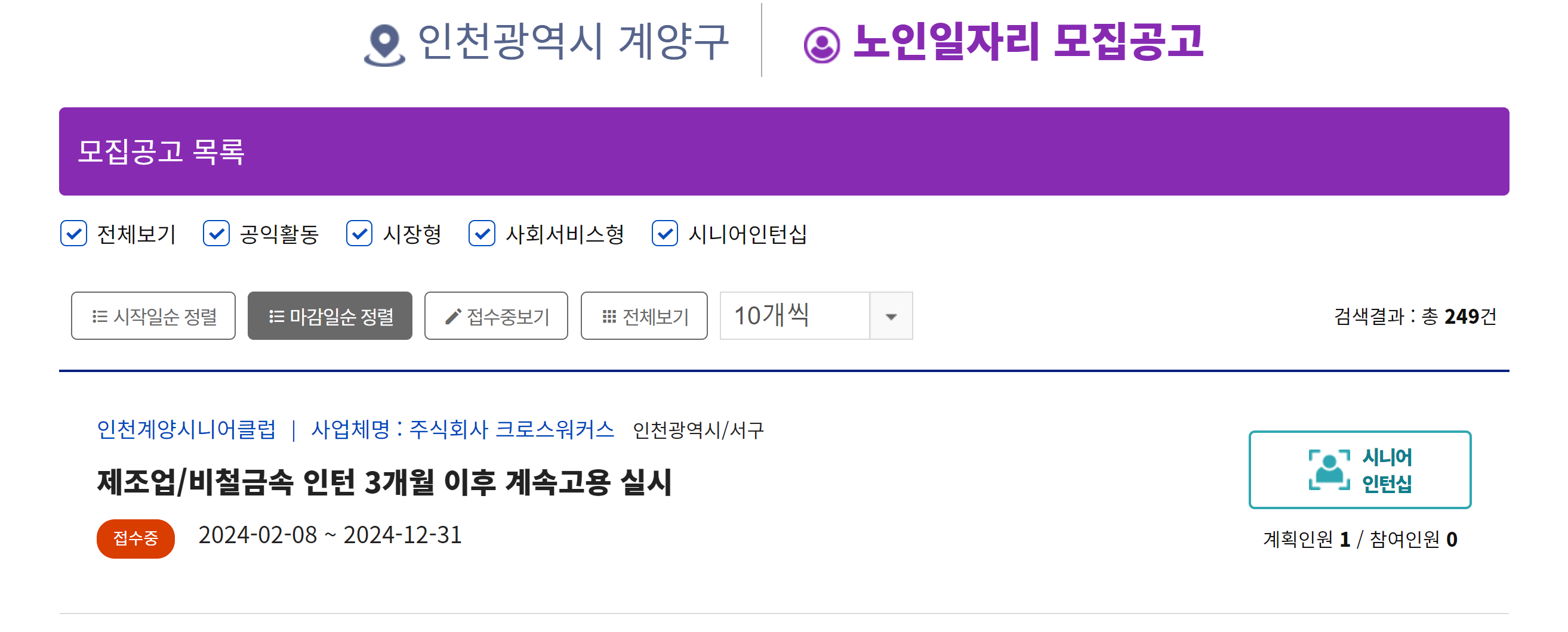 인천 계양구만 클릭하여 검색한 결과 노인일자리 모집공고 검색결과는 총 294건입니다.