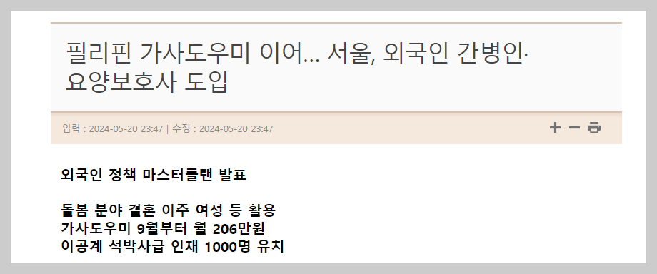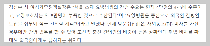 최근 서울시에서 늘어난 간병 수요에 맞춰 외국인 간병인 도입을 적극 건의하겠다고 밝힌 바 있어 향후 변화가 기대됩니다.