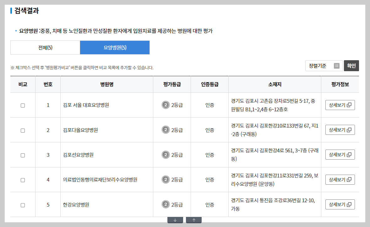 예시로 상세검색에서 경기도 김포시에 있는 요양병원을 검색해 보았습니다.