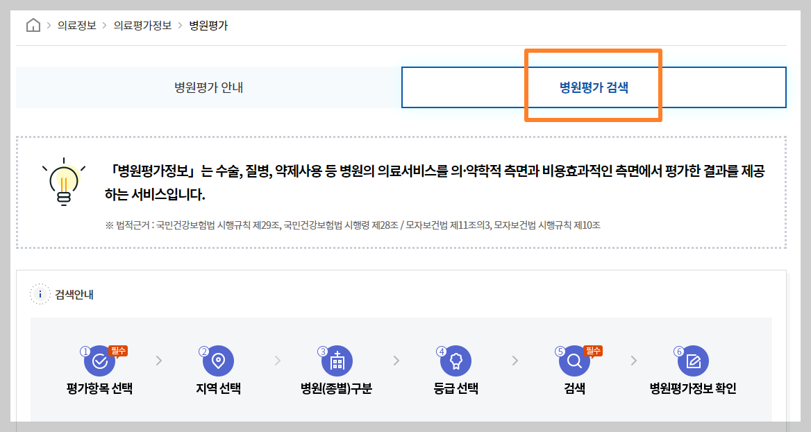 상단 메뉴에서 의료정보 - 의료평가정보- 병원평가- 병원평가검색으로 들어갑니다.