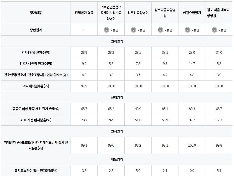 심평원 홈페이지에서 찾은 김포 소재 다섯 개 요양병원의 평가내용을 자세히 살펴보겠습니다.