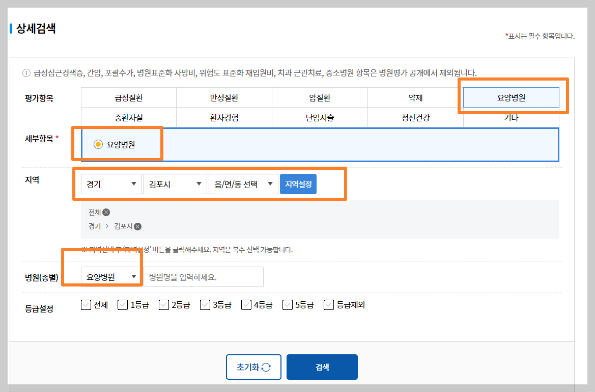 예시로 상세검색에서 경기도 김포시에 있는 요양병원을 검색해 보았습니다.