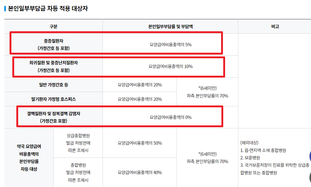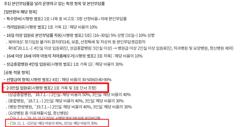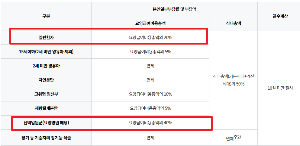 하지만 의료보호인 경우나 중증질환, 희귀 질환 등일 경우에는 본인부담금이 10%, 5%, 0%가 되기도 하고 요양병원 입원이 굳이 필요하지 않고 다른 요양시설이나 외래진료가 적절하다고 판단되는 '선택입원군'일 경우에는 본인부담금이 40%입니다.