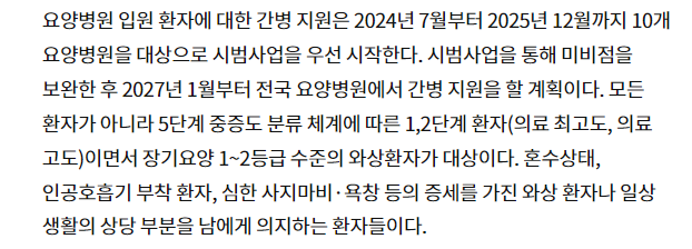 최근 정부에서는 요양병원 간병비에 대해 건강보험 적용에 관한 시범사업을 진행하고 있습니다.