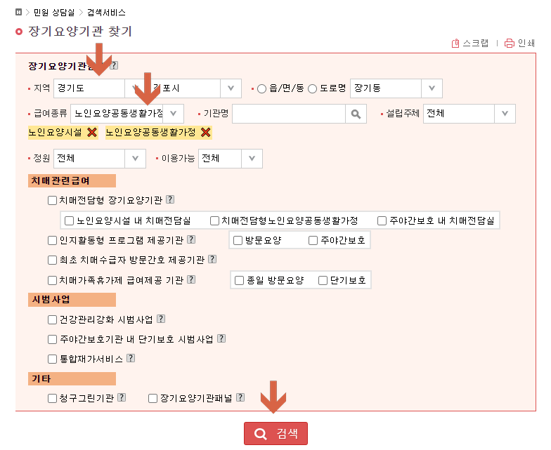 국민건강보험공단 장기요양보험 | 민원상담실 | 검색서비스 | 장기요양기관 찾기