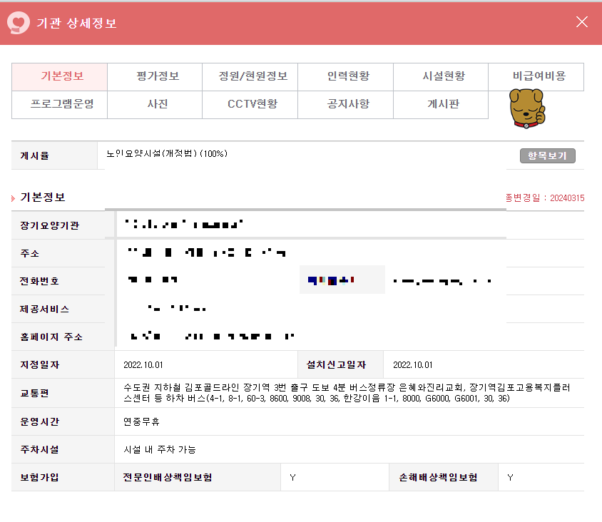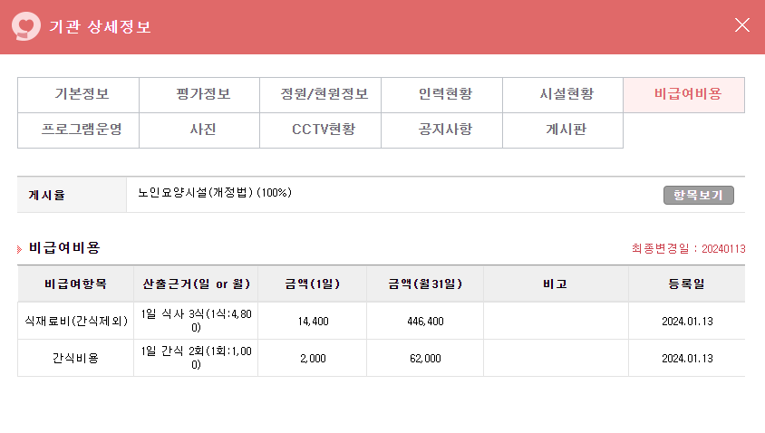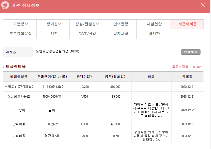 비급여 비용은 요양원마다 차이가 있기 때문에 직접 상담해 보시거나 국민건강보험공단 홈페이지에서 기관 검색 후 기관상세정보에서 알 수 있습니다.