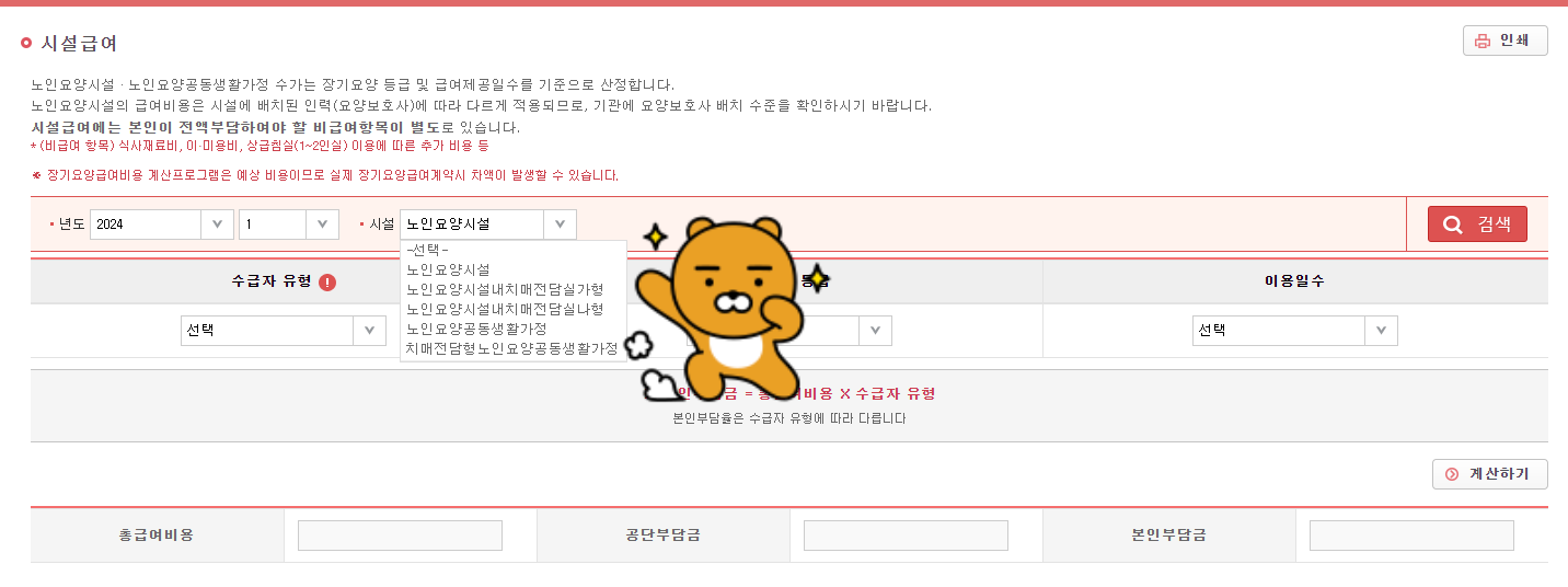 장기요양보험 홈페이지에서 대략의 계산을 해볼 수 있으며 정확한 비용은 직접 시설에 문의해 보는 것이 좋습니다.