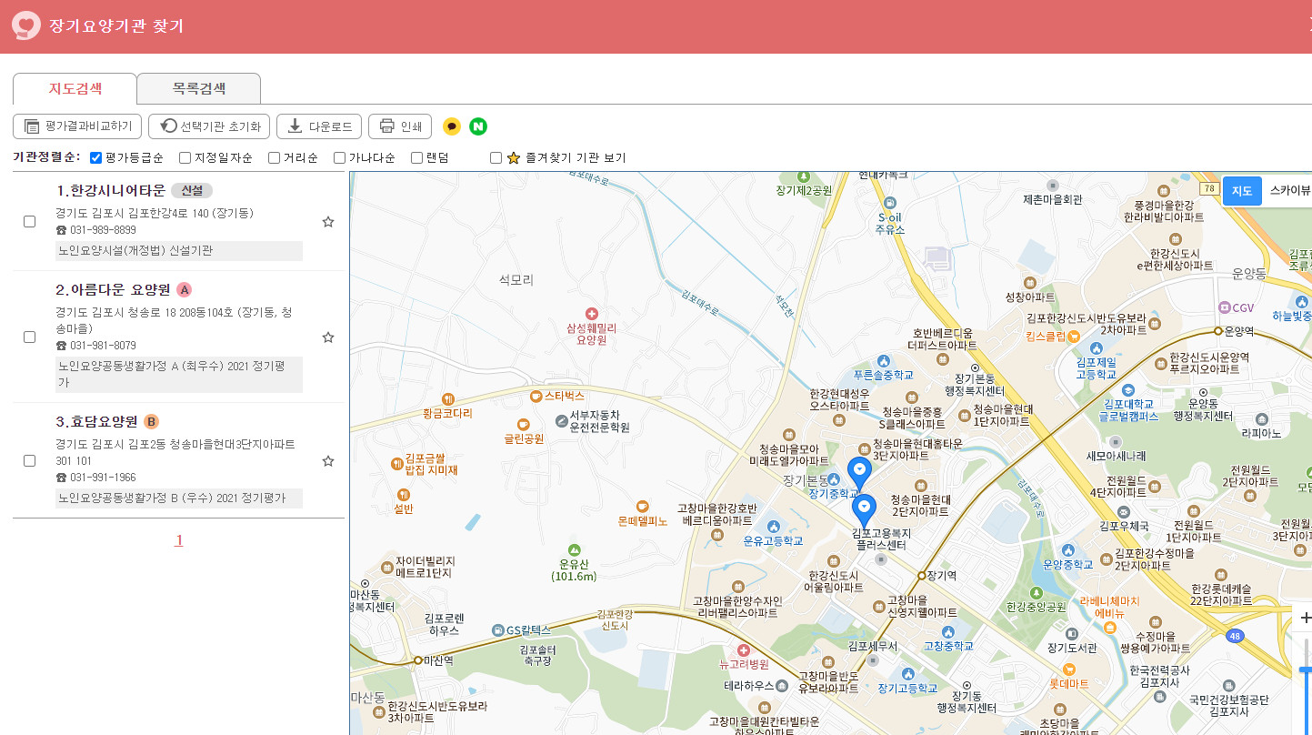 국민건강보험공단 장기요양보험 | 민원상담실 | 검색서비스 | 장기요양기관 찾기