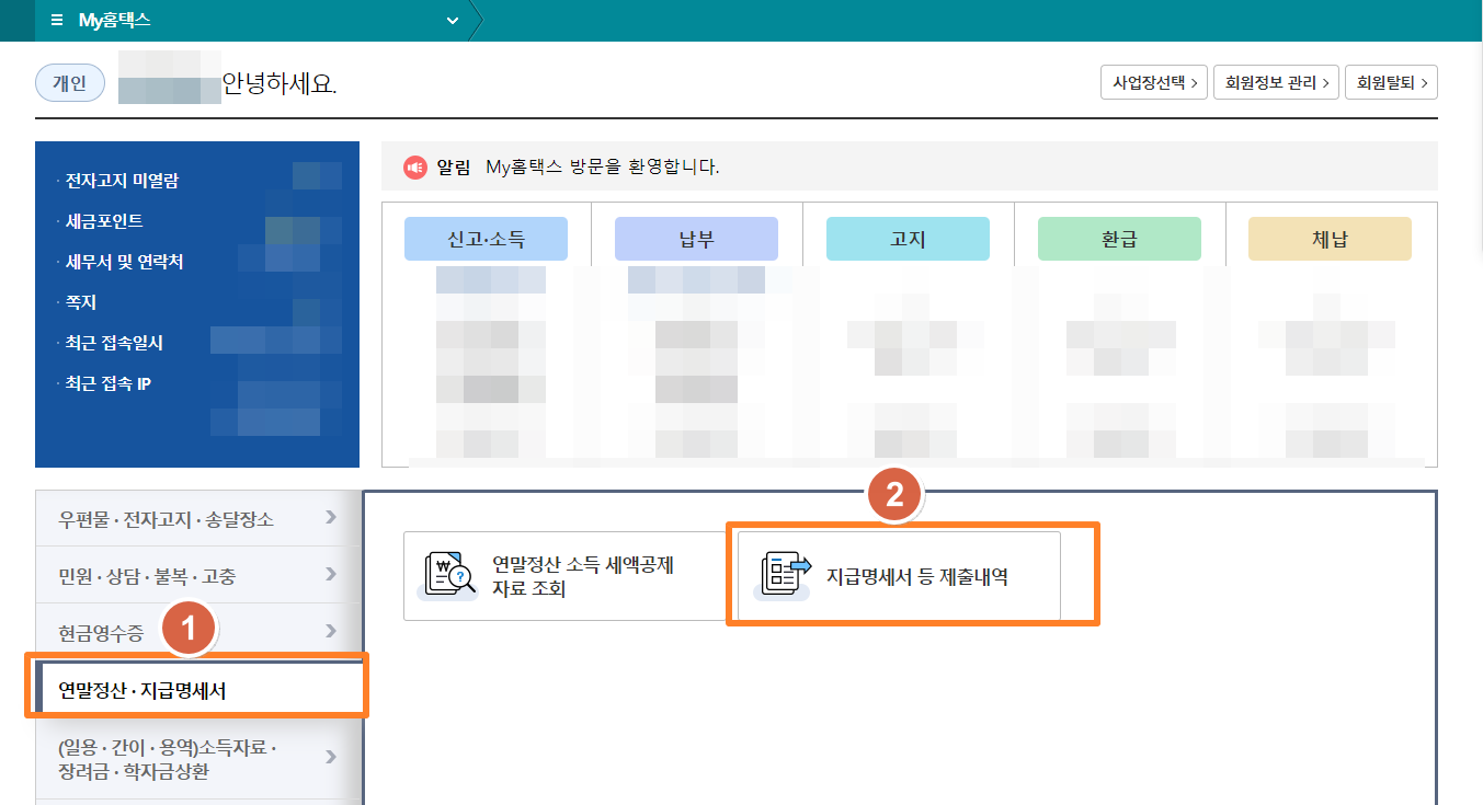 로그인 후 My홈택스(개인)에서 연말정산 간소화. 지급명세서 항목을 선택합니다.