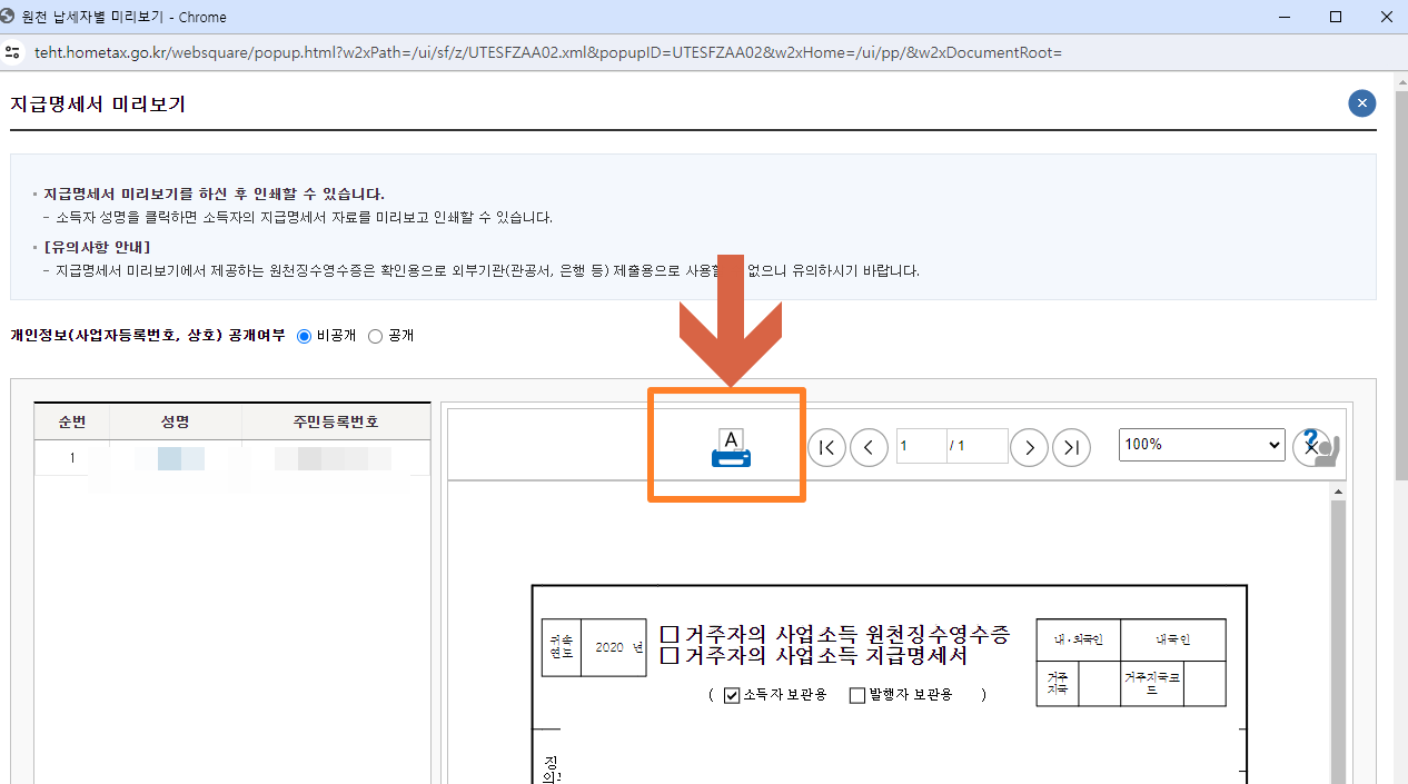 위 창에서 필요한 지급명세서의 종류를 클릭하면 새창이 뜨고 필요한 원천징수영수증을 출력할 수 있습니다.